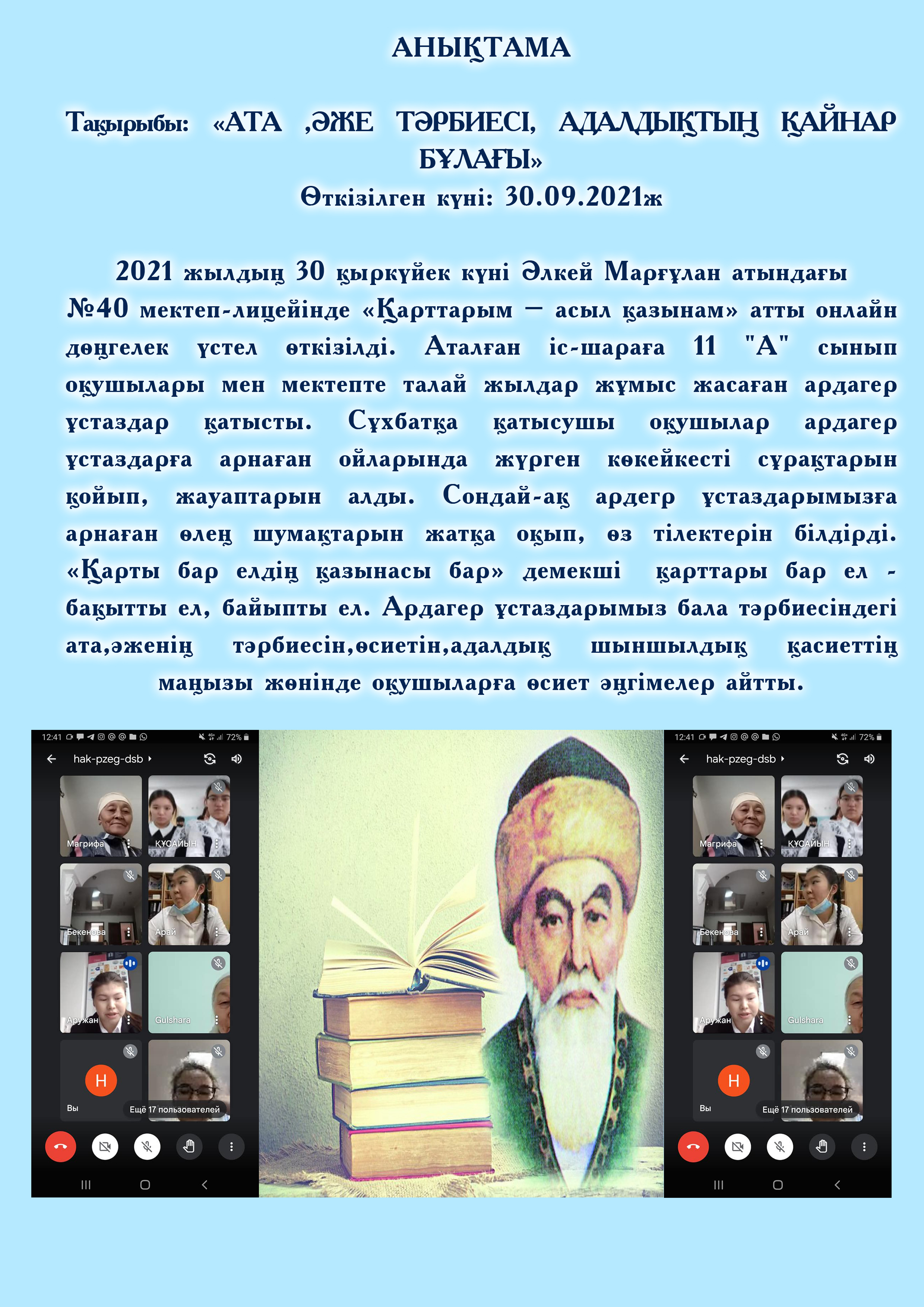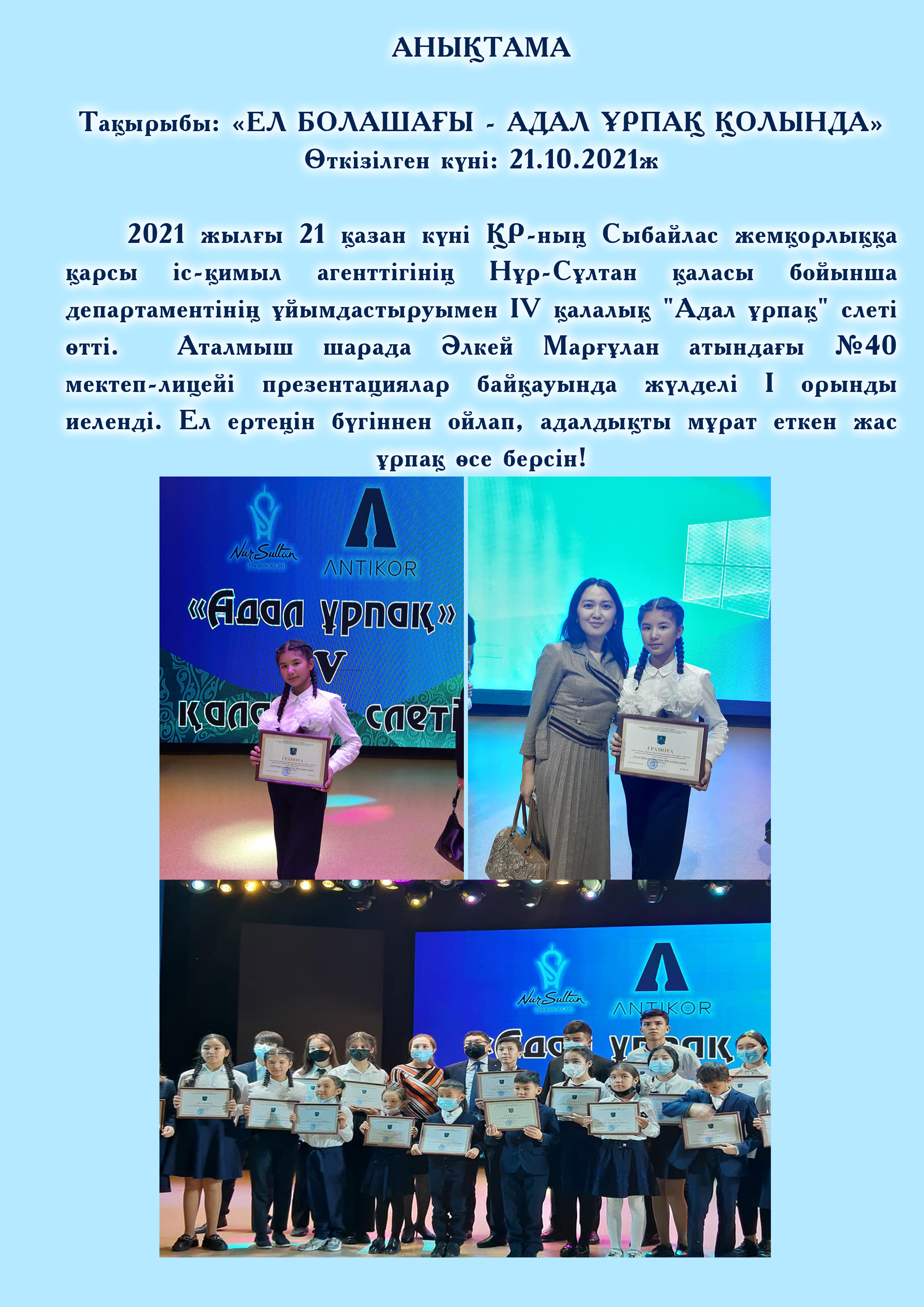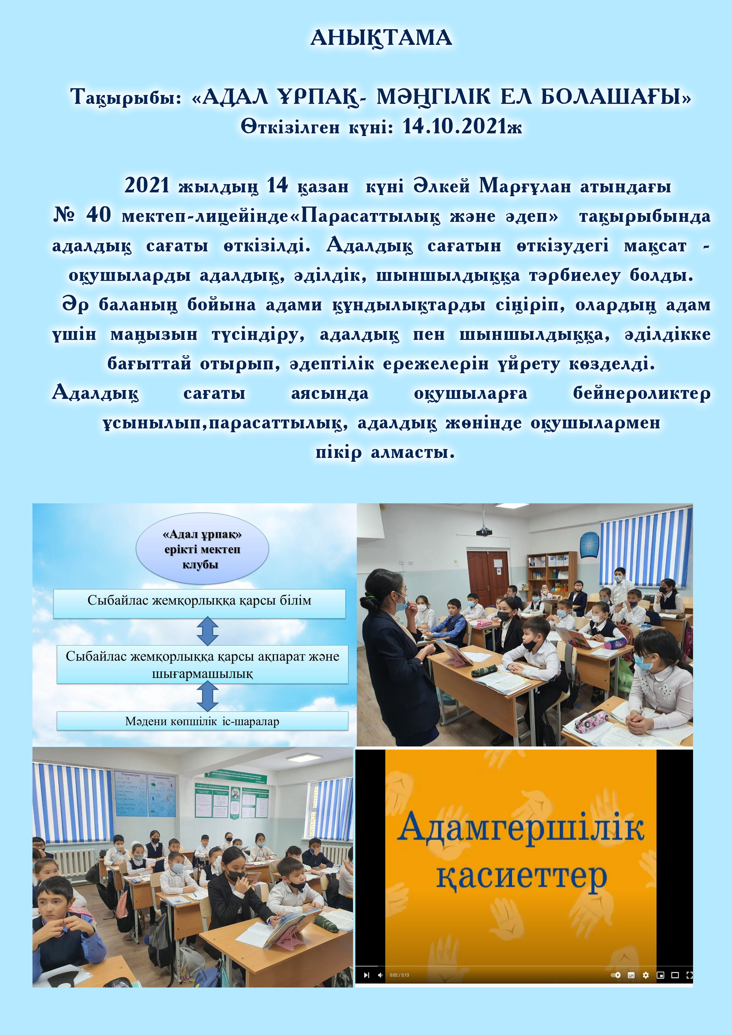 АДАЛДЫҚ САҒАТЫ Әлкей Марғұлан атындағы №40 мектеп-лицейінде жалпыреспубликалық «Адалдық сағаты» акциясы аясында сыныптарда «адалдық сағаттары» өткізілді. Сынып жетекшілер тиісінше, оқушылармен Адалдық – ардың ісі, адал еңбек бәрін жеңбек және тағы да басқа тақырыптарда тәрбие сағаттары өткізіліп, оның құндылықтары жайлы түсіндіріп өтілді. Сынып жетекшілер адалдық жөнінде ұлы ғұламалардың сөздерімен, оқушылардың бойына адалдық қасиеттерін ұғындыра білді.