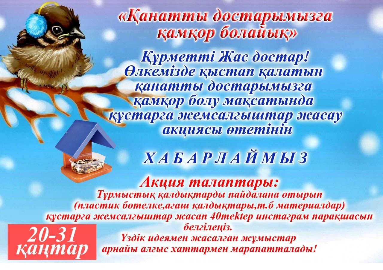 Қанатты достарымызға қамқор болу мақсатында құстарға жемсалғыштар жасау акциясы өтетіндігін хабарлаймыз!