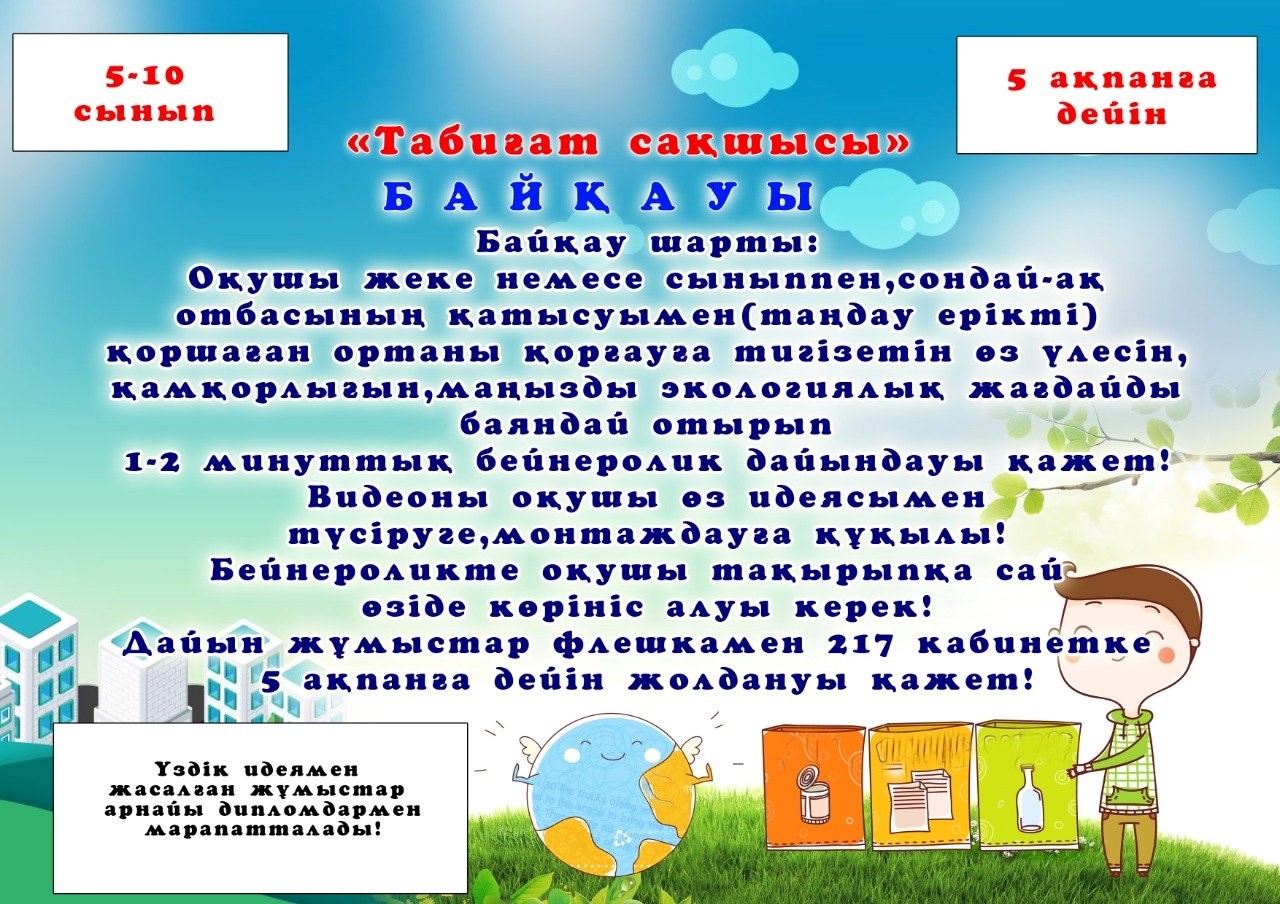 5-ақпанға дейін жарияланған "ТАБИҒАТ САҚШЫСЫ" атты байқауға Әлкей Марғұлан атындағы №40 мектеп-лицейінің 7 "Д" сынып оқушылары, 8 "Г" сынып оқушылары Қарабай Аружан, Шаяхмет Аружан, Сайлаубай Мәдина атсалысты. Оқушылар қоршаған ортаны қорғауға арналған бейнероликтерін экологиялық жағдайды баяндай отырып мәлімдеді.