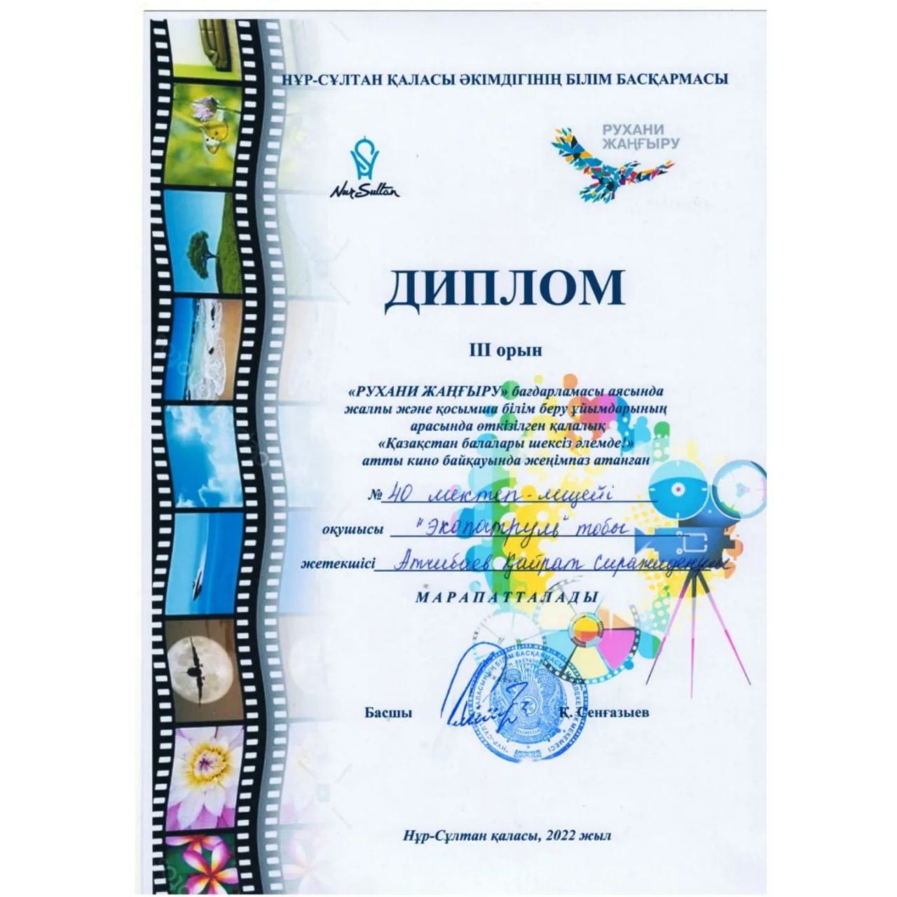 Нұр-Сұлтан қаласы Білім басқармасының рухани жаңғыру бағдарламасы аясындағы "Қазақстан балалары шексіз әлемде" атты қысқа метражды кино байқауы ақпан айында бастау алған болатын. Осы аталған қалалық байқауға өз жұмыстарын жолдаған мектебіміздің "Экопатруль" тобы байқаудың III- дәрежелі дипломына ие болды. Сондай-ақ, жеңімпаз оқушыларымыз байқаудың республикалық кезеңіне жолдама алды. Құттықтаймыз!