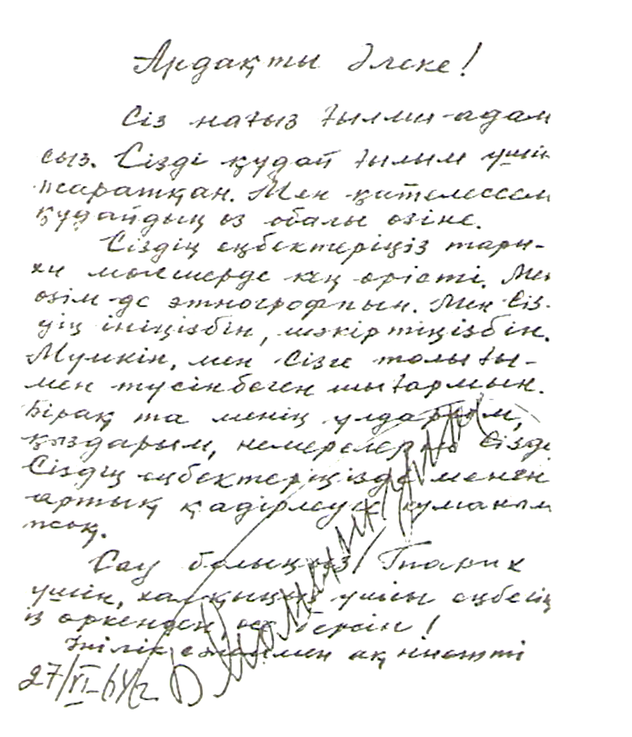 Сіздің еңбектеріңіз тарихи мөлшерде кең өрісті. Мен өзім де этнографпын. Мен Сіздің ініңізбін, шәкіртіңізбін. Мүмкін, мен Сізге толығымен түсінбеген шығармын. Бірақ та менің ұлдарым, қыздарым, немерелерім, Сізді, Сіздің еңбектеріңізді менен артық қадірлеуге күмәным жоқ.